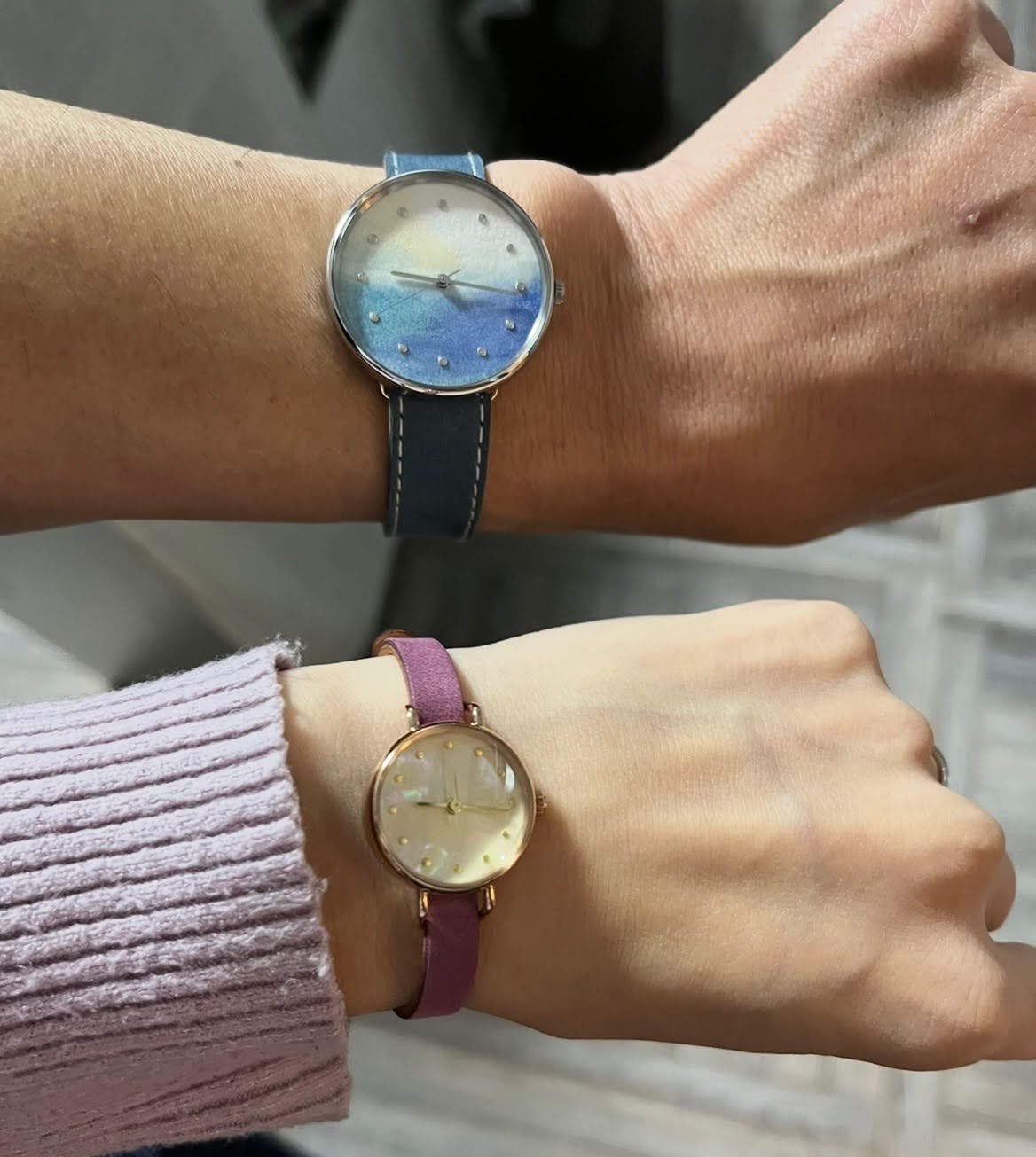 写真ではわかりませんでしたが、実物は角度によってキラキラと光って見えます。ふんわりとした色味の文字盤と、それを引き立てるような落ち着いたグレーのバンド。